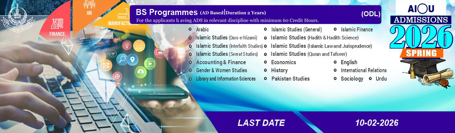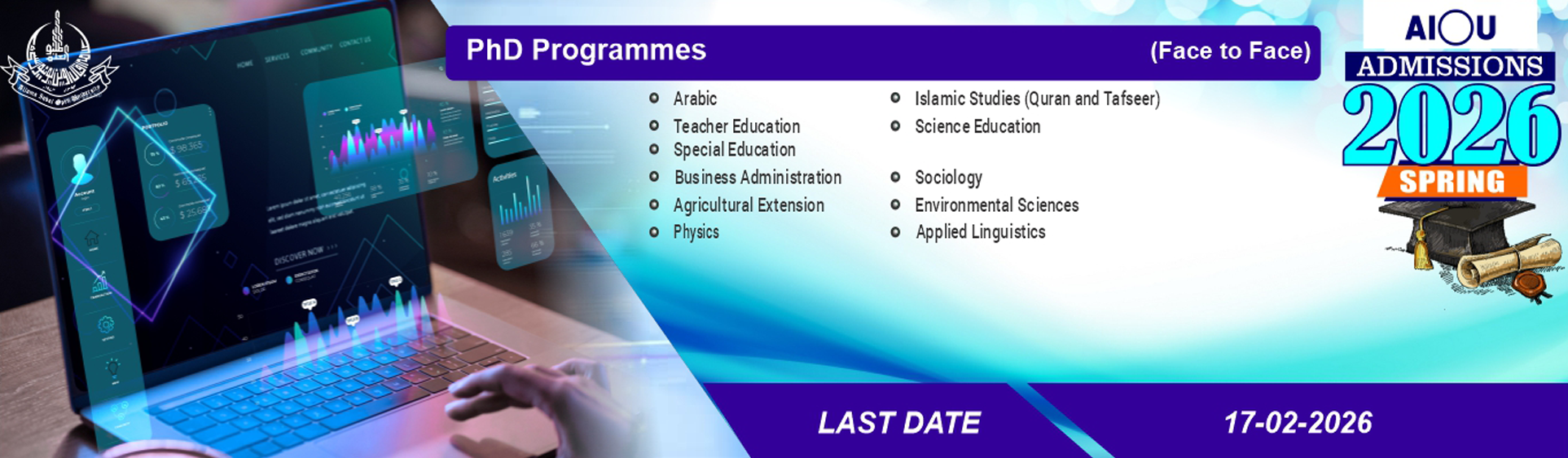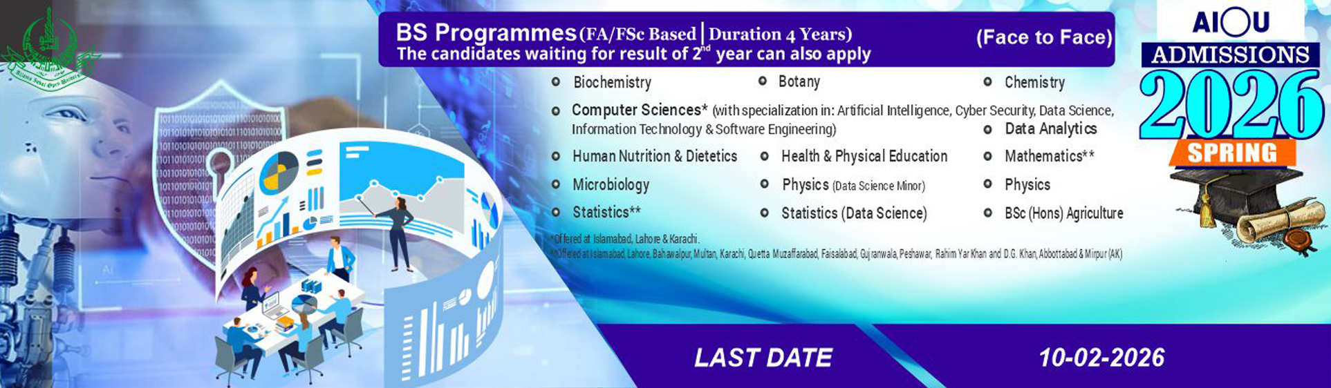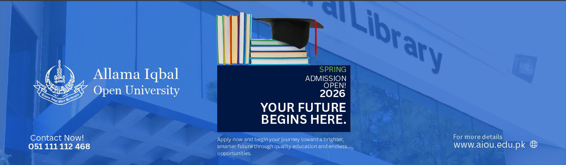 Allama Iqbal Open University, the largest university of Asia in distance education, which primarily focuses on the educational needs of masses by providing quality education at their doorsteps all over the country and by blurring spatial and temporal boundaries. Currently, the university offers unique educational opportunities to a huge proportion of 1 million students in a diverse and dynamic range of programs starting from Matriculation to the PhD level.