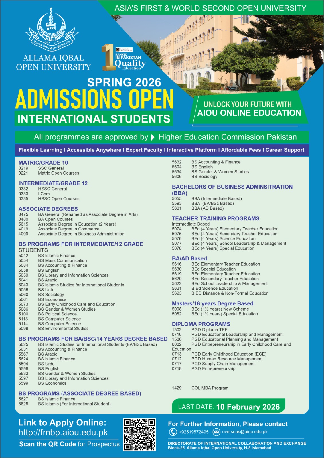Directorate of International Collaboration & Exchange is offering Online Admissions to the International and Overseas Students via online mode of study in the following Programs: